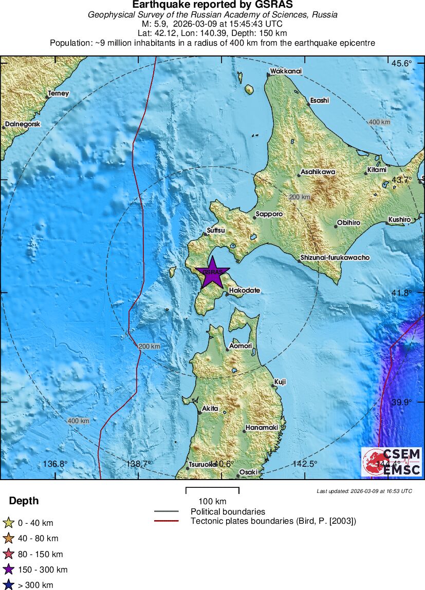 | 5.9 | 150 | 8529 | 16:45 | Link | Matige beving - HOKKAIDO, JAPAN REGION - Vandaag |